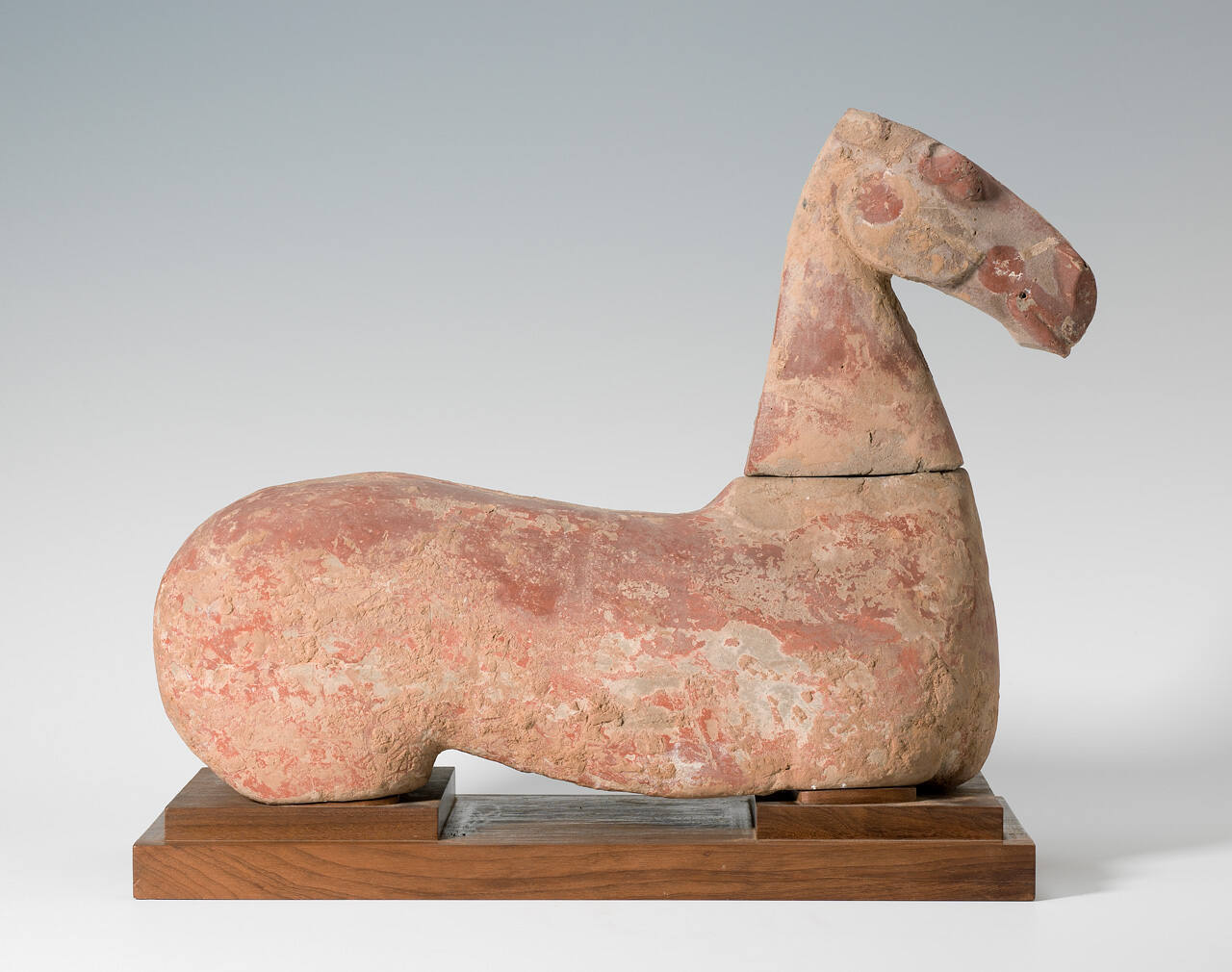 DescriptionBody of an unglazed pottery horse. Head is separate. Missing tail and all four legs. Mounted on wood base. Traces of red pigment.Provenance