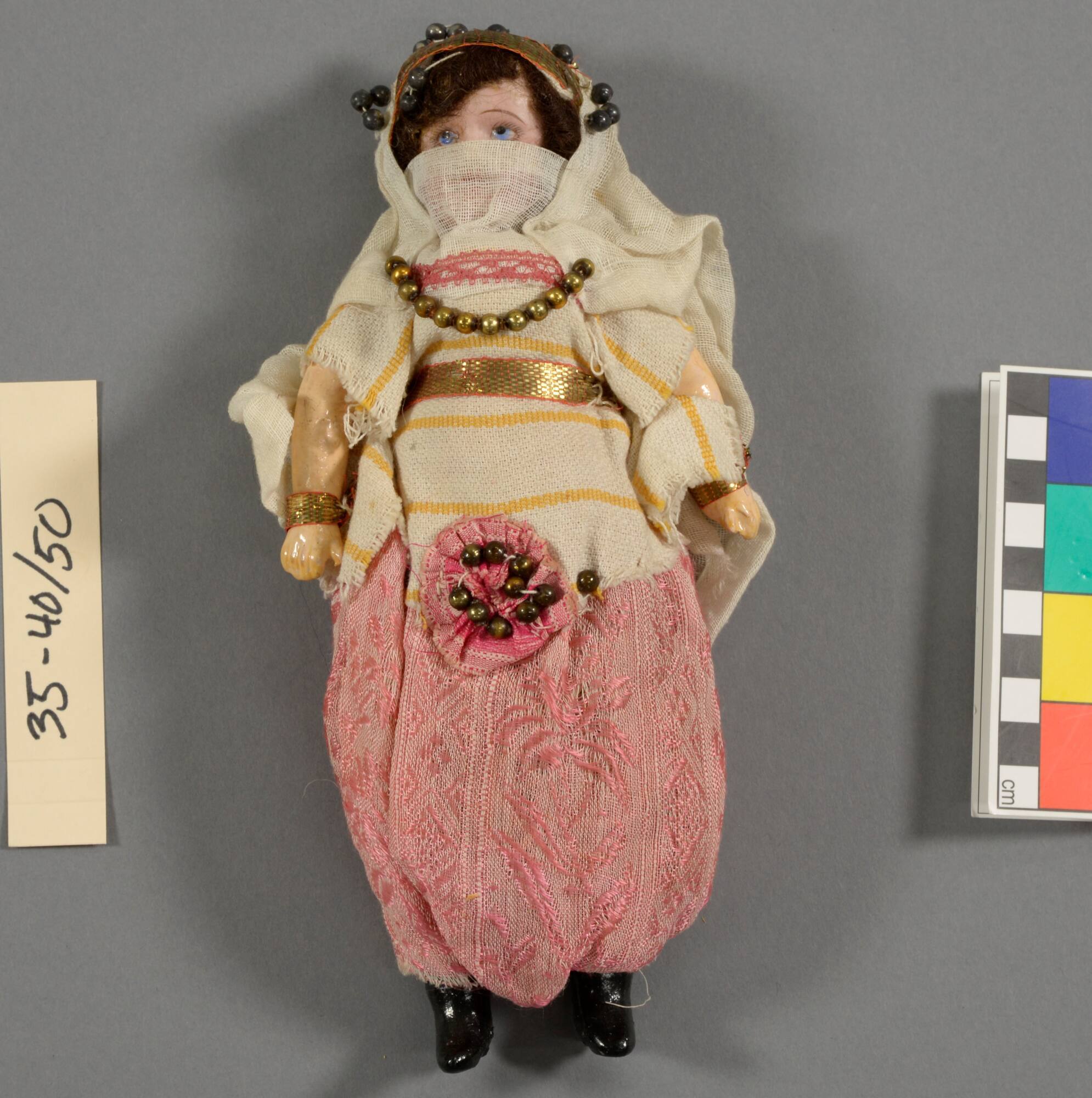 DescriptionLady in pink trousers and yellow and white blouse, white veil over head and across face, gold beads.ProvenancePearle Scales Moore (1867-1934), Peoria, IL, by 1934 [1];