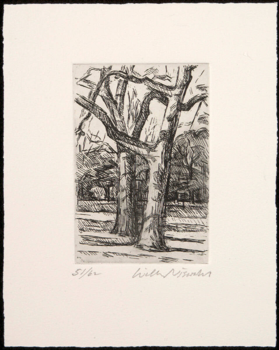 DescriptionTwo large trees, no leaves, in foreground. hillside with other trees and growth. Sky is mostly white as seen through branches of two large trees.Copyright© Wilbur Niewald