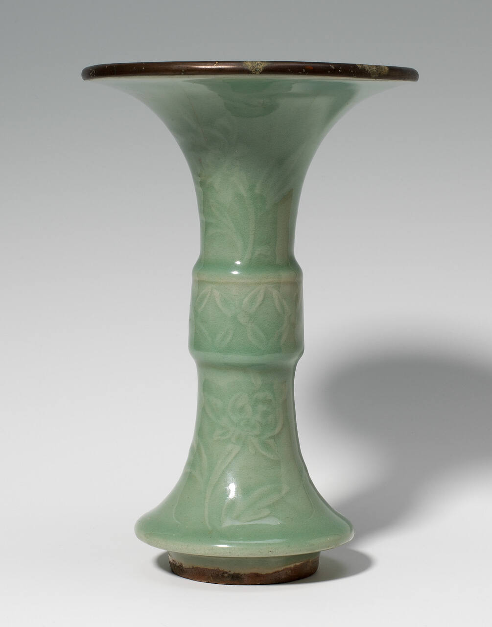 DescriptionBeaker of the bronze type "Ku". Slightly raised floral design under celadon glaze.