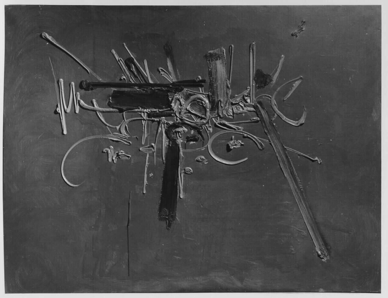 DescriptionOn flat, brown-grey ground calligraphic design in broad predominantly vertical brush strokes in black and crimson, arabesques in heavy crimson and black impasto applied "a la prima" from the tube. Touches of brilliant green at top and center.Copyright© Artists Rights Society (ARS), New York / ADAGP, Paris