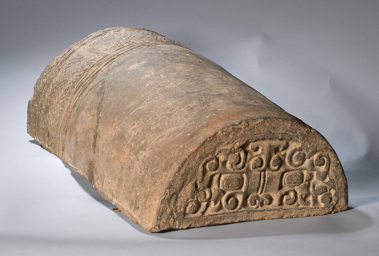 DescriptionCeramic roof tile in a semi-circular, tube shape. On one end the surface is roughened by hatching. On the other end is a semi-circular plaque with a type of t'ao-t'ieh mask design.ProvenanceWith Huang Po Ch'uan, by March 31, 1933 [1];