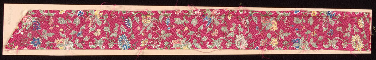 DescriptionRed ground brocaded with blue, green, yellow and pink. Design of lotus and tendrils.