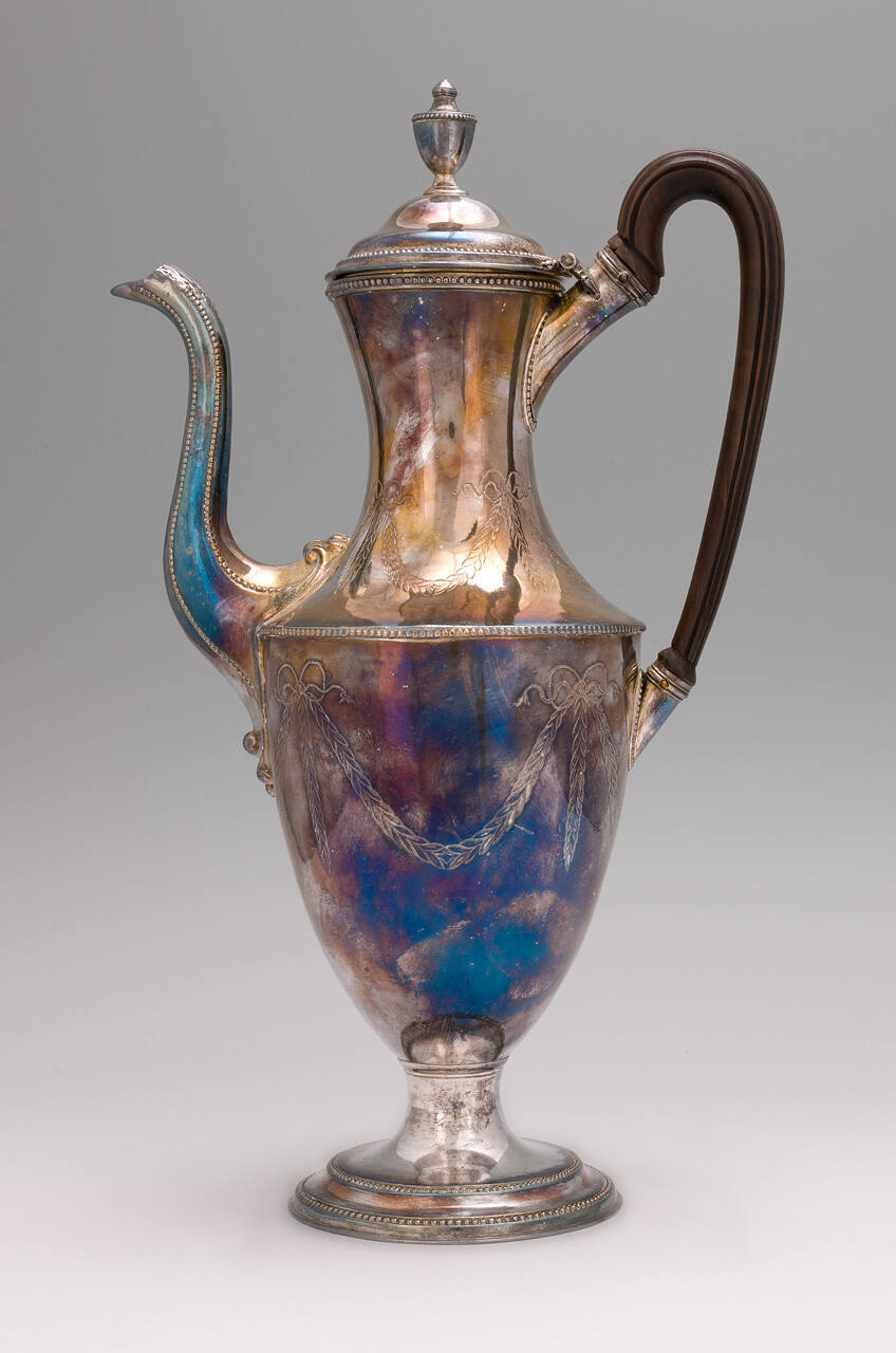 DescriptionVase-shaped coffee pot engraved with festooning on body, with bead decoration on body, spout, foot, and lid. Domed cover with vase-shaped finial. Curved wood handle.