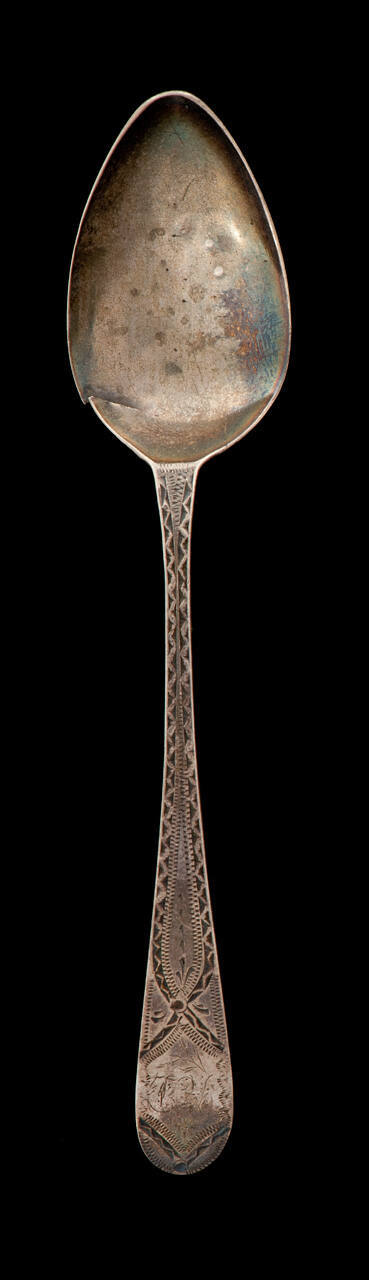 DescriptionUnadorned bowl; narrow stem widens and turns under slightly at the end. Recessed zig-zag pattern outlines stem, crossing at the handle. Marks on understem: PB AB, lion passant, date r, George III.