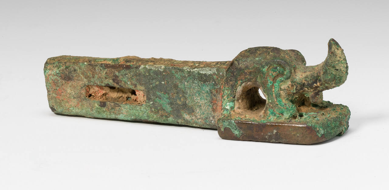 DescriptionOne of a pair of complete linchpins. Top ornamented with hook-beaked bird in full relief.