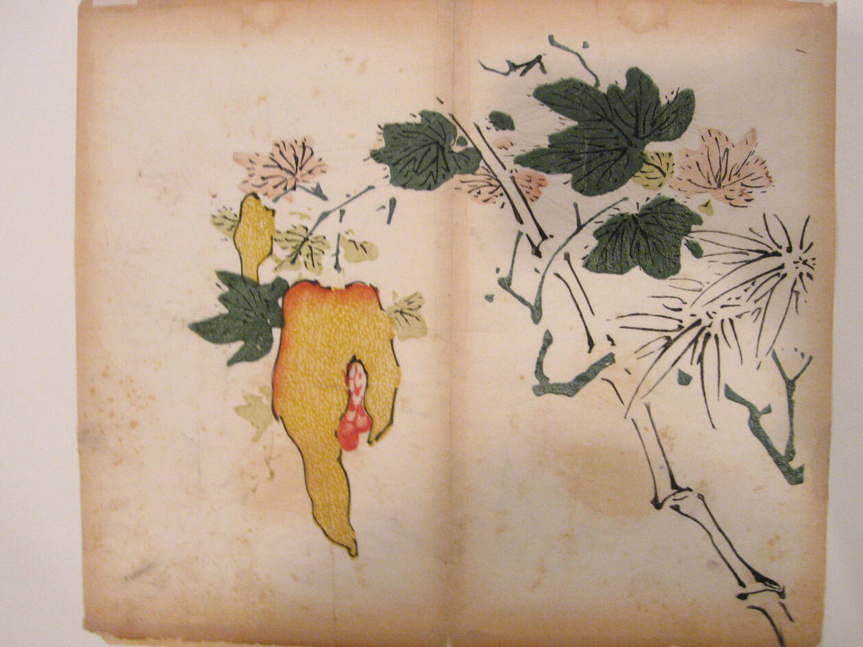 Gallery LabelRipened fruit suggests the richness and abundance nurtured in a blissful orchard. These prints depicted the juicy fruits frequently found on the dining tables of Chinese families. For example, lotus root and water caltrops-favorite seasonal food-were used to make special dishes, soups or snacks.