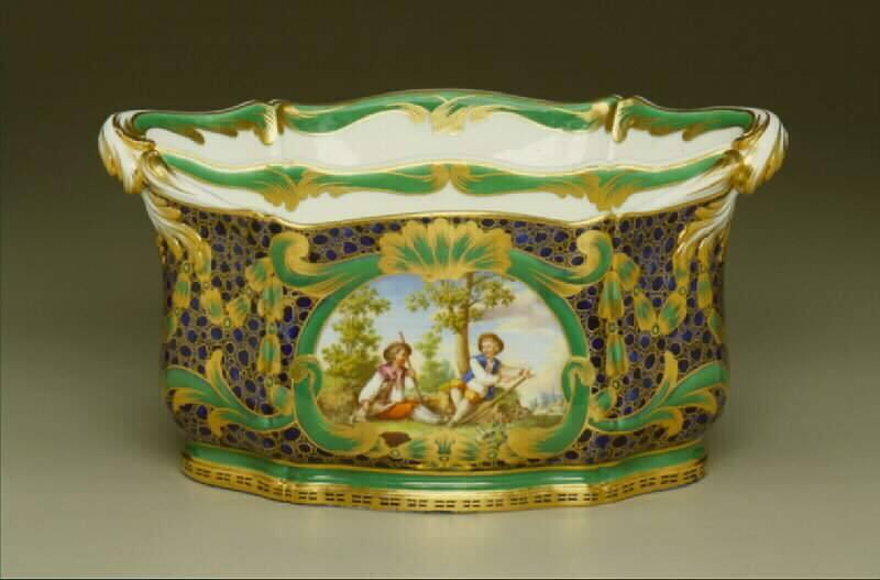 DescriptionThe flower vase is oval in plan and has shaped walls with scrollwork "handles" in relief at each side. The rim is set lower at the front than at the back, and there is a partition that runs along the center. The exterior of the vase is decorated with a dark blue ground, set with a colored reserve to the front. The reserve is painted with a rustic scene of two figures of young men in country clothes. One is holding a dog, and the other is gesturing towards a village in the background. This scene is framed by scrolling bands of green ground set over the blue. Green scrolls and husks form a pattern over the blue that follows around the side and under each "handle". A band of green ground is placed around the base over a thin strip of blue, and to the rear there is a green scrolling "Catherine wheel" frame, enclosing a reserve of blue ground. Scrolling bands of green ground also are set along the inside of the top of the central partition and of the rear rim. Thick brightly burnishe dgilding is set over the blue ground in a "caillouté" pattern of pebbles, groups of four dots and amoebae. Gilding also frames the borders of the ground color panels, scrolls and husks, the rims, and hightlights the modelling of the handles. A bold pattern of burnished gilding of circles, lines, and dots is set over the strip of blue ground at the base. Gilding highlights the Catherine wheel frame on the rear, which is set in the center with a finely tooled and partly burnished bouquet of leaves and mixed flowers, including roses and jonquils.Exhibition HistoryLuxury and Passion: Inventing French Porcelain, The Nelson-Atkins Museum of Art, Kansas City, Missouri, August 13 2022–August 12 2024, no cat.