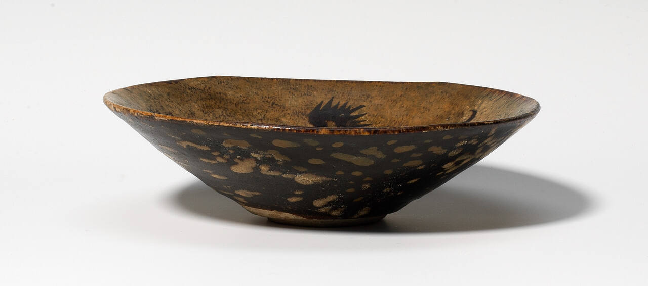 DescriptionBowl with a light brown and tan glaze, with brown phoenixes on the inside; with a box.