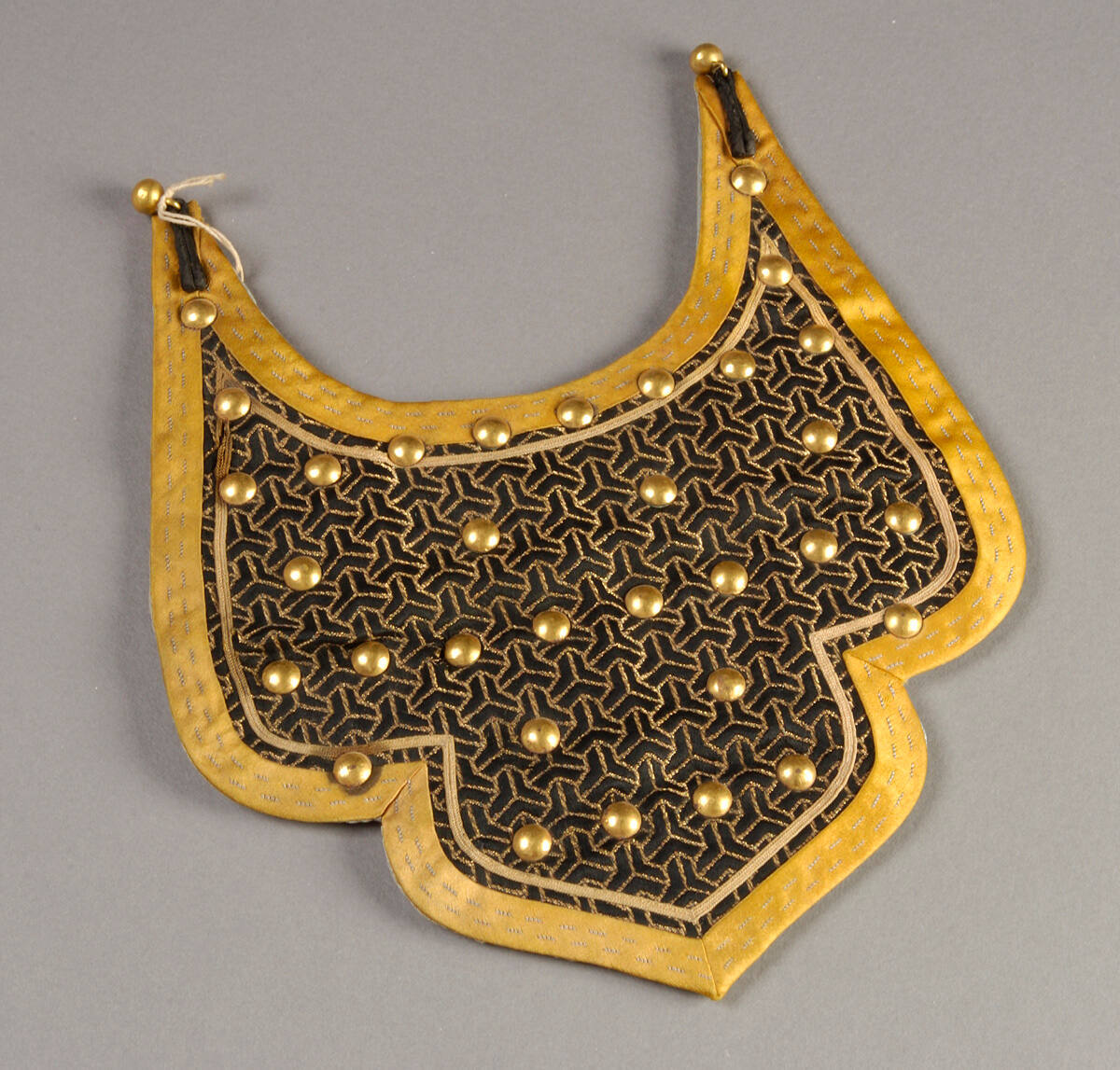 DescriptionPiece from suit. Gold and black brocade in scale armor pattern, lined with steel plates and studded with gilt bronze nails.