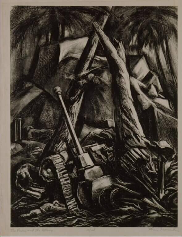 DescriptionA vertical format image rendered in strong chiaroscuro depicting a war scene in rocky terrain. A torn, blasted trea rises, leaning at center. Visible also are two soldiers and the suggestion of others in trenches, a tank and gun, and ammunition.Copyright© Louis and Elsie Freund Estate / Jerry Bedford