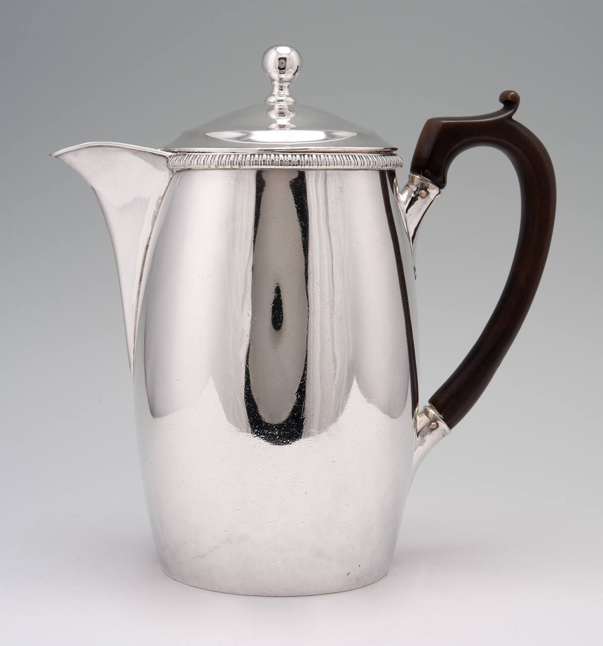 DescriptionCask-shaped coffee jug with no decoration except for a gadrooned edge around the top of the jug. Slightly domed cover with ball finial; the cover is removable. Scroll-shaped wood handle.
