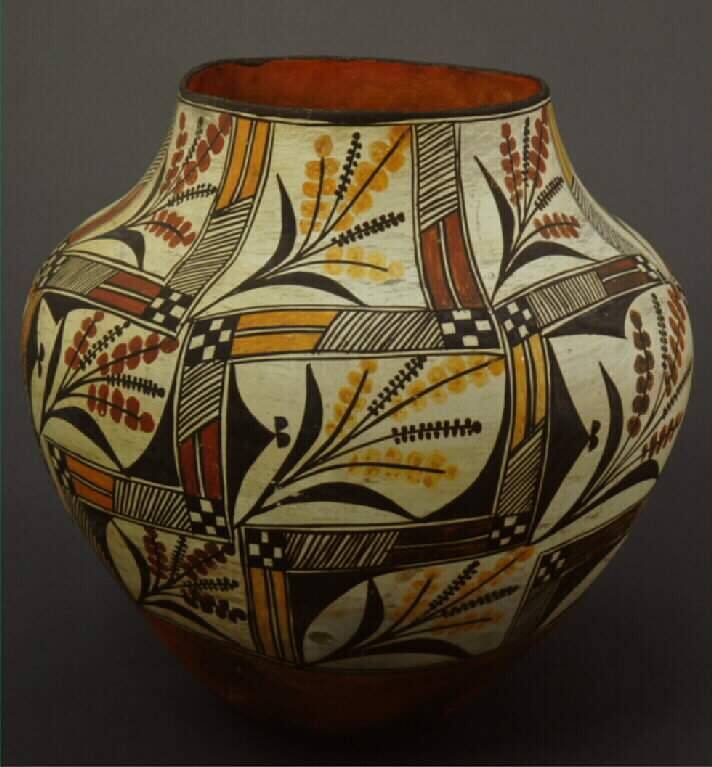 DescriptionHigh-shouldered spherical jar covered with a white slip (upperbody) and a solid red slip underbody. the jar is painted black. slip upperbody is completely covered with a repeat design that consists of sprigs of berries painted in a stepped pattern with hatching.