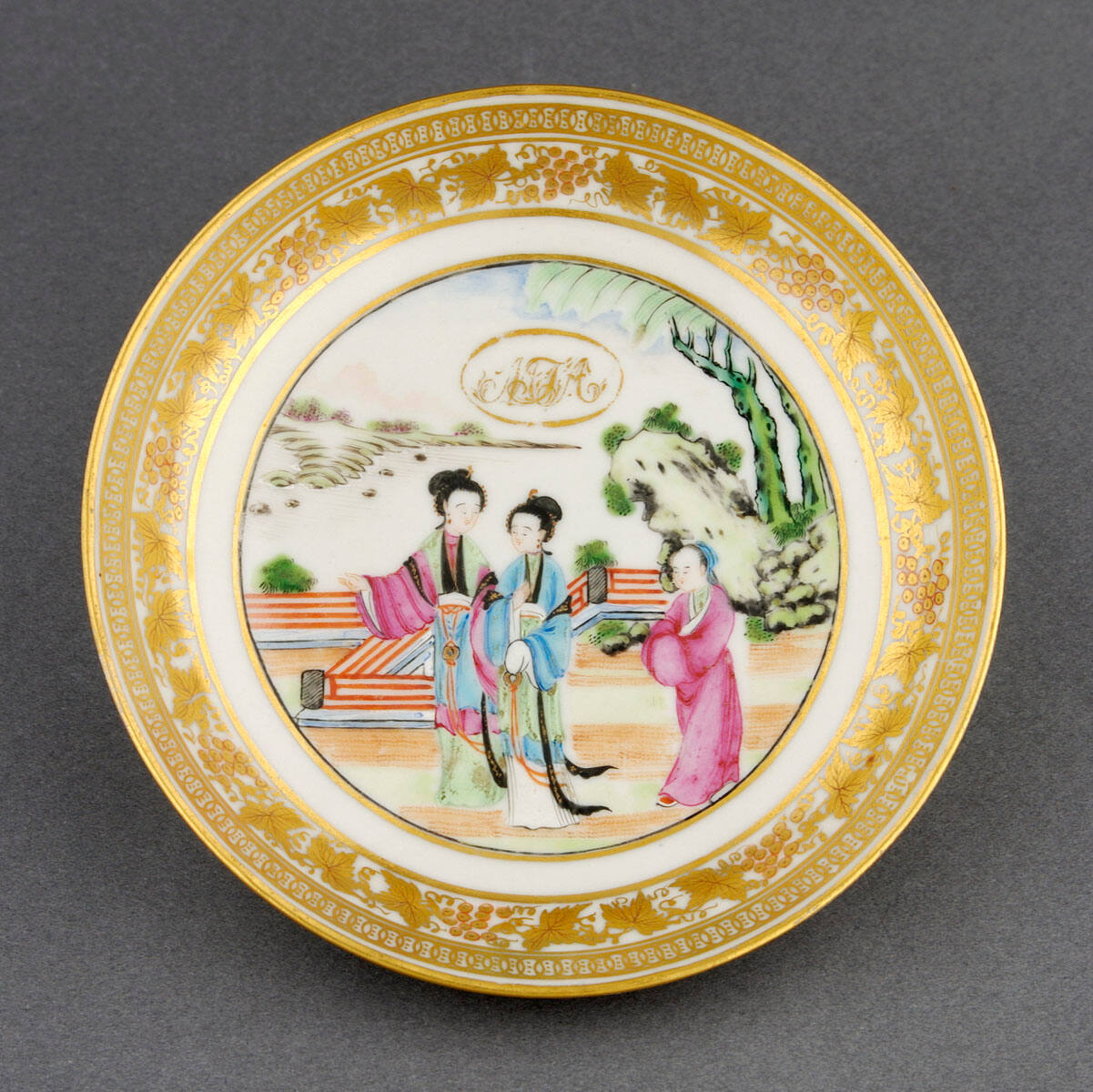 DescriptionPart of seventy-seven piece tea and coffee service. In bottom of saucer and on interior sides of cups is a scene painted in Famille rose style showing two Chinese ladies and attendent in garden. Above figs is gold monogram, MTA, in gold oval. On interior sides of all pieces is border design in gold of grape bunches and leaves.