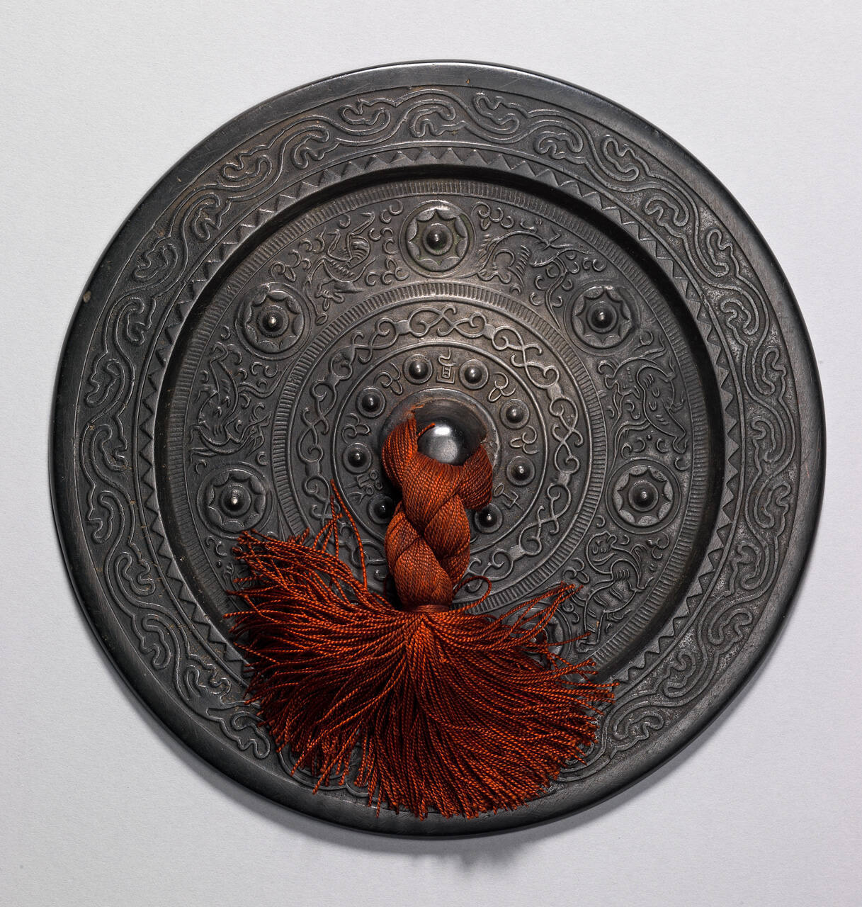 DescriptionCircular mirror decorated with a series of bands, the innermost of which contains nipples, then a band with a scroll pettern, a wider band with seven animals alternating with seven nipples, then another band with a scroll pattern at the outermost edge. A large silk tassel is attached to a ring in the center.