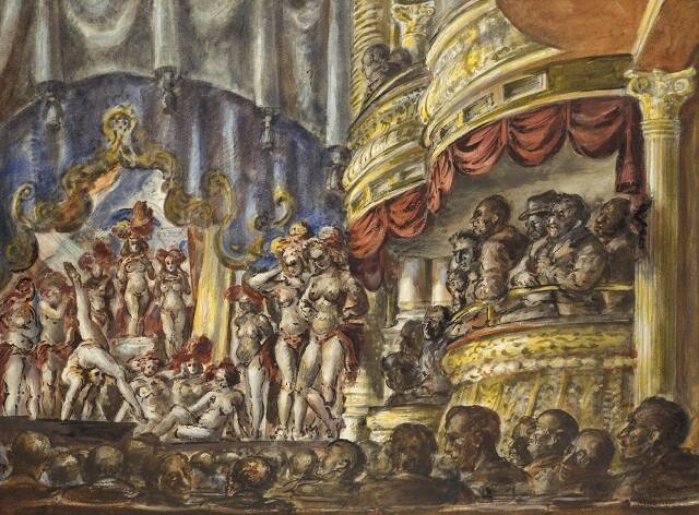 DescriptionThe watercolor shows a male audience watching a burlesque performance in an ornate theater. On the left, overarched by a heavy curtain, is the stage on which a number of semi-nude women stand and sit while one performs acrobatics. At upper right one sees the curved, highly-decorated upper-tier theater boxes. Below them is an orchestra-level box jam-packed with spectators. The heads of other audience members, some seen from the rear, are depicted in the foreground.Exhibition HistoryAmerican Art Deco: Designing for the People, 1918-1939, The Nelson-Atkins Museum of Art, Kansas City, Missouri, July 9 2022–January 8 2023, no cat.