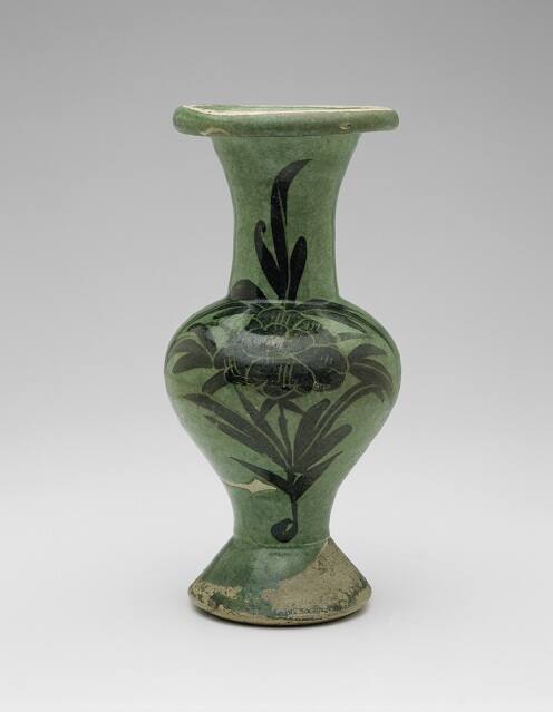 DescriptionBannister shaped vase of Tzu Chou type, floral designs in black painted and engraved on opposite sides under glaze; green over-glaze.