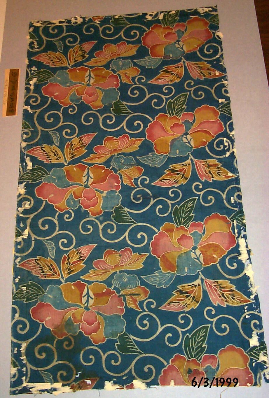 DescriptionCotton with paste resist and stencil dyeing, probably from a bedding cover (futonji) with floral design.