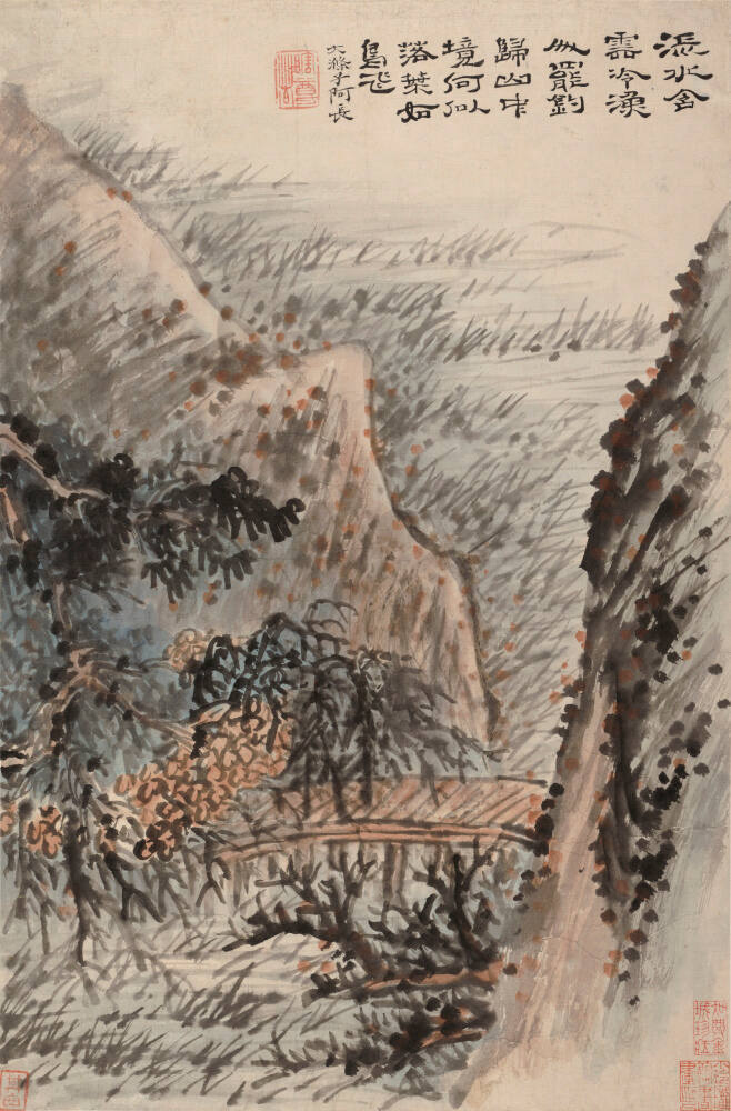 DescriptionFootbridge between steep mountains; ground covered with fallen leaves.