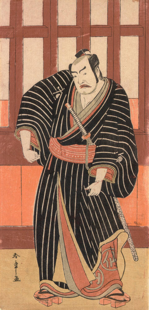 DescriptionThe print depicts an actor from Karigane gonin otoko 雁金五人男 (the Five Men of the Karigane Gang), which is a play produced at the Nakamura Theater during the second month in 1780. The print is in hosoban nishiki-e format.