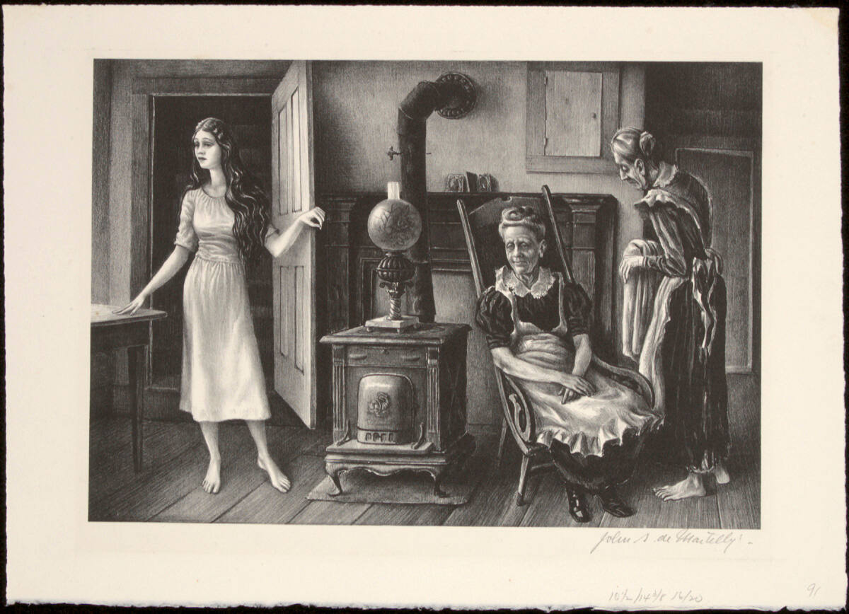 DescriptionThree women are in an interior, the younger one on the left appears to have come through a door. An older woman stands at the right, and next to her sits another woman by a stove.CopyrightThis work is copyrighted. Contact the copyright holder for permission to reproduce.