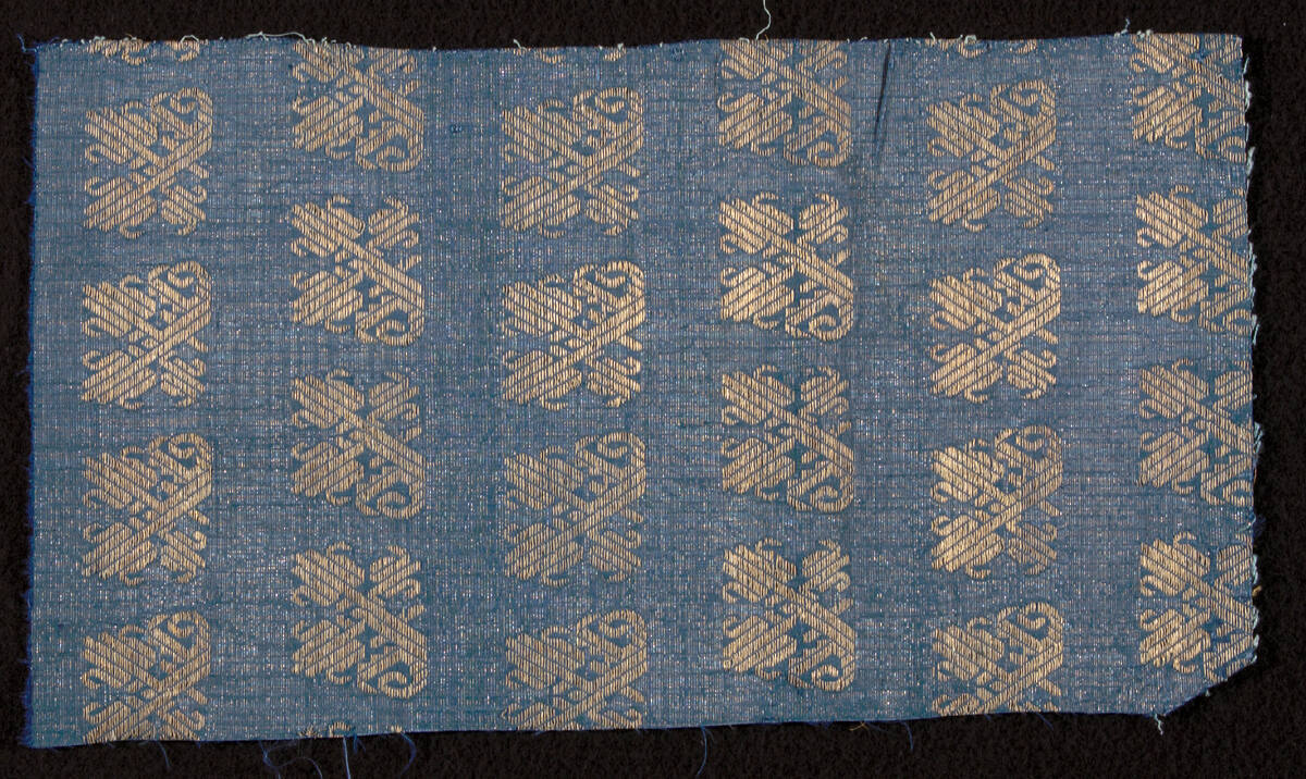 DescriptionBlue silk, ripped tabby with supplementary silver weft, brocade with silver gilt