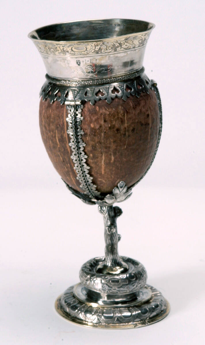 DescriptionThree bands of silver, wire-like and fleur-de-lis desgin, over coconut shell; wide, outward-curving lip with band of decoration at top, encircling coil and more fleur-de-lis design at bottom. Cup part is set on a knotted tree trunk with a circular, two-tiered base. Markings on outside of cup's lip.