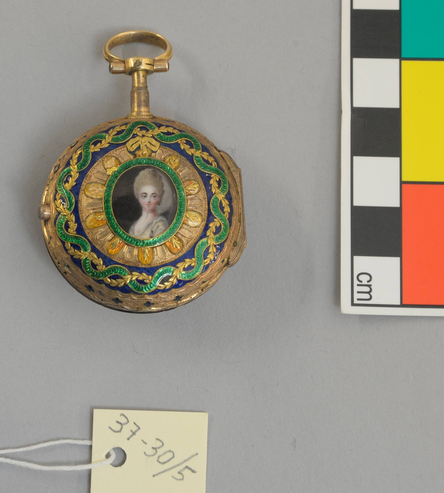 DescriptionWatch with hinged gold case. Border of brilliant blue and green enamel with gold. Oval medallion of woman in 18th c. dress in center surrounded by green enamel border. Rounded crystal and white face with Roman numerals.