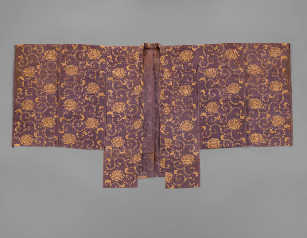 DescriptionPurple silk gauze ground with gold-thread brocade and paper toggle at tie. No robe (Choken type) with chrysanthemum vine (kikukarakusa) design.