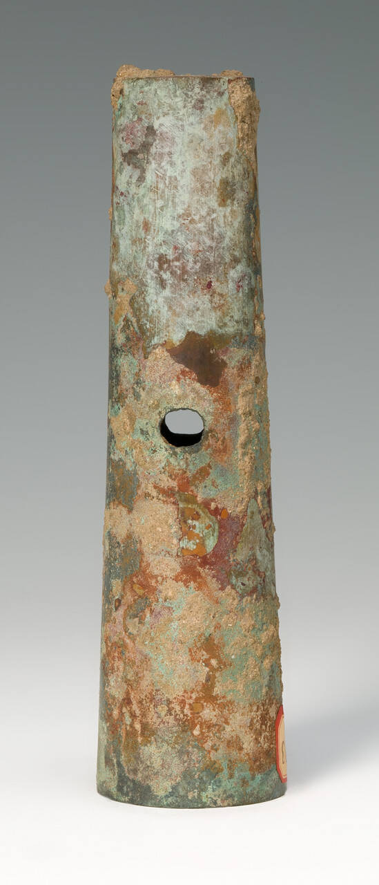 DescriptionTubular shaped pole end with one end closed; two holes for pins; no decoration. Green and red patina.ProvenanceT'ang Hsiao Wu, Peiping (modern-day Beijing), China, by March 30, 1934;