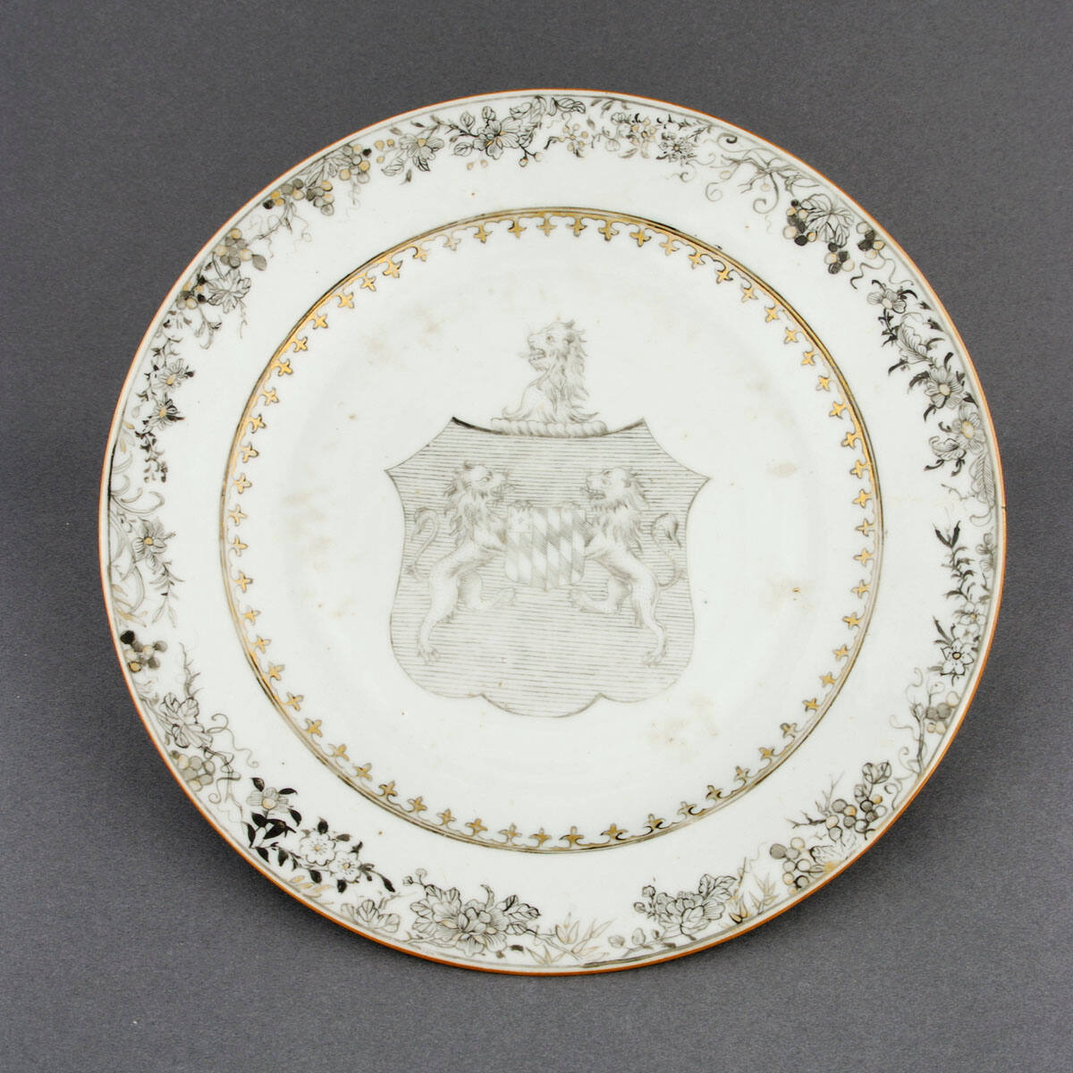DescriptionArmorial plate, probably Jesuit, a Coat-of-Arms with two lions rampant. Gilded spear-head motif on edge of cavetto; floral motif on shoulder painted in black and gold.