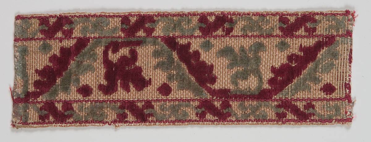 DescriptionContinuous border design of conventionalized leaves in red and green on a pink background.