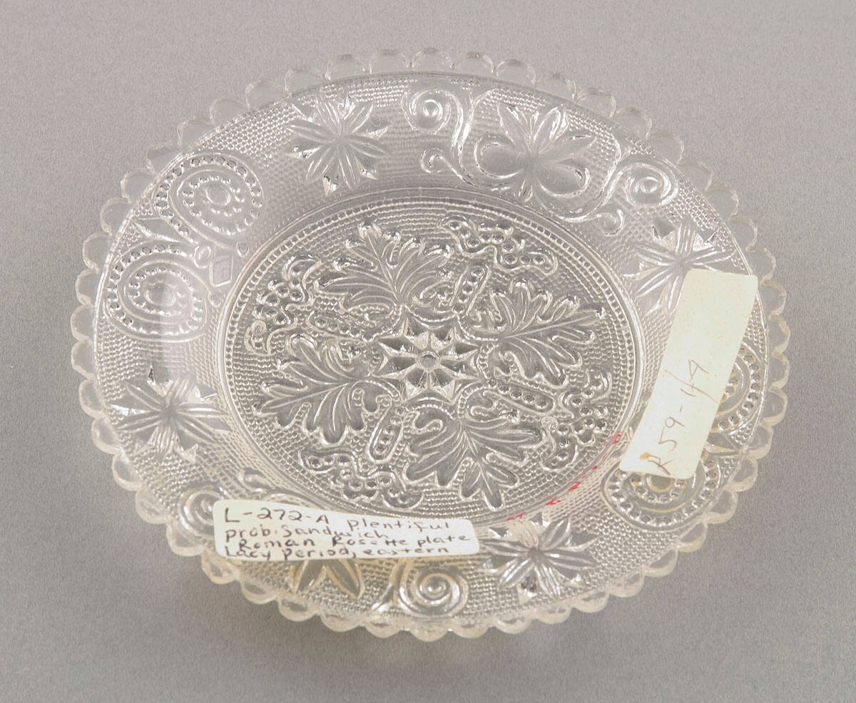 DescriptionClear glass cup plate with 49 scallops on rim. Four central leaves with other floral designs on stippled background in center; border decorated with two rams horn designs, two leaves and four flowers on stippled background.