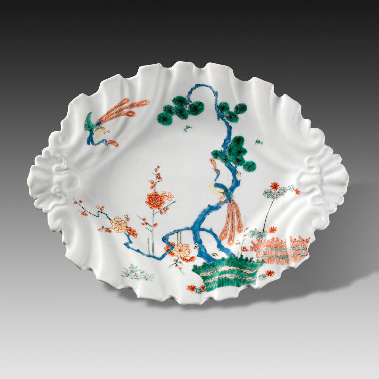 DescriptionThis cast white porcelain oblong dish is decorated with painted enamel bird and plant motifs in the Kakiemon style. The rim of the dish has drapery-like undulations that curve across the four quadrants of the outer perimeter of the piece. These meet on the left and right sides of the rim and are accented on each side with a raised decorative motif.