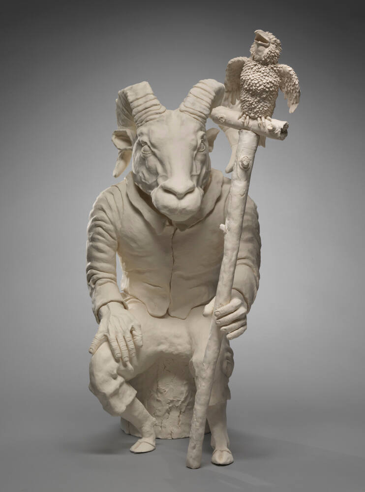 Using unglazed porcelain, the Alabama sculptor Frank Fleming creates works that appear both realistic and mythological. The fineness and strength of the porcelain allows Fleming to craft believable half goat, half human creatures through exacting attention to detail. By clothing these figures, Fleming helps the viewer to relate to them and confront the dualities of the rational and the irrational sides of human nature. In Hunter of the Pleasured Souls and Sacred Spirits, Fleming connects the supernatural and the living world, creating a haunting beast that both attracts and repels.