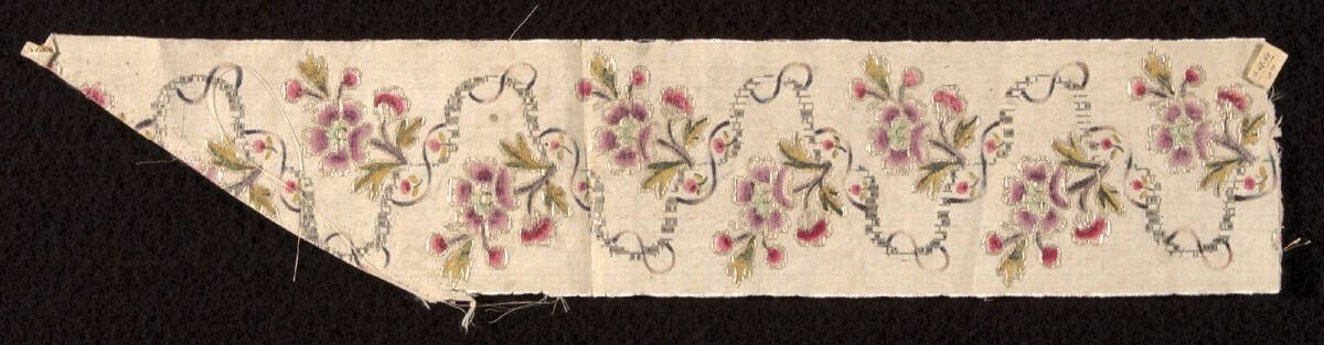 DescriptionCream silk, brocaded with silver strip and silver-gilt thread. With painted polychrome flowers.