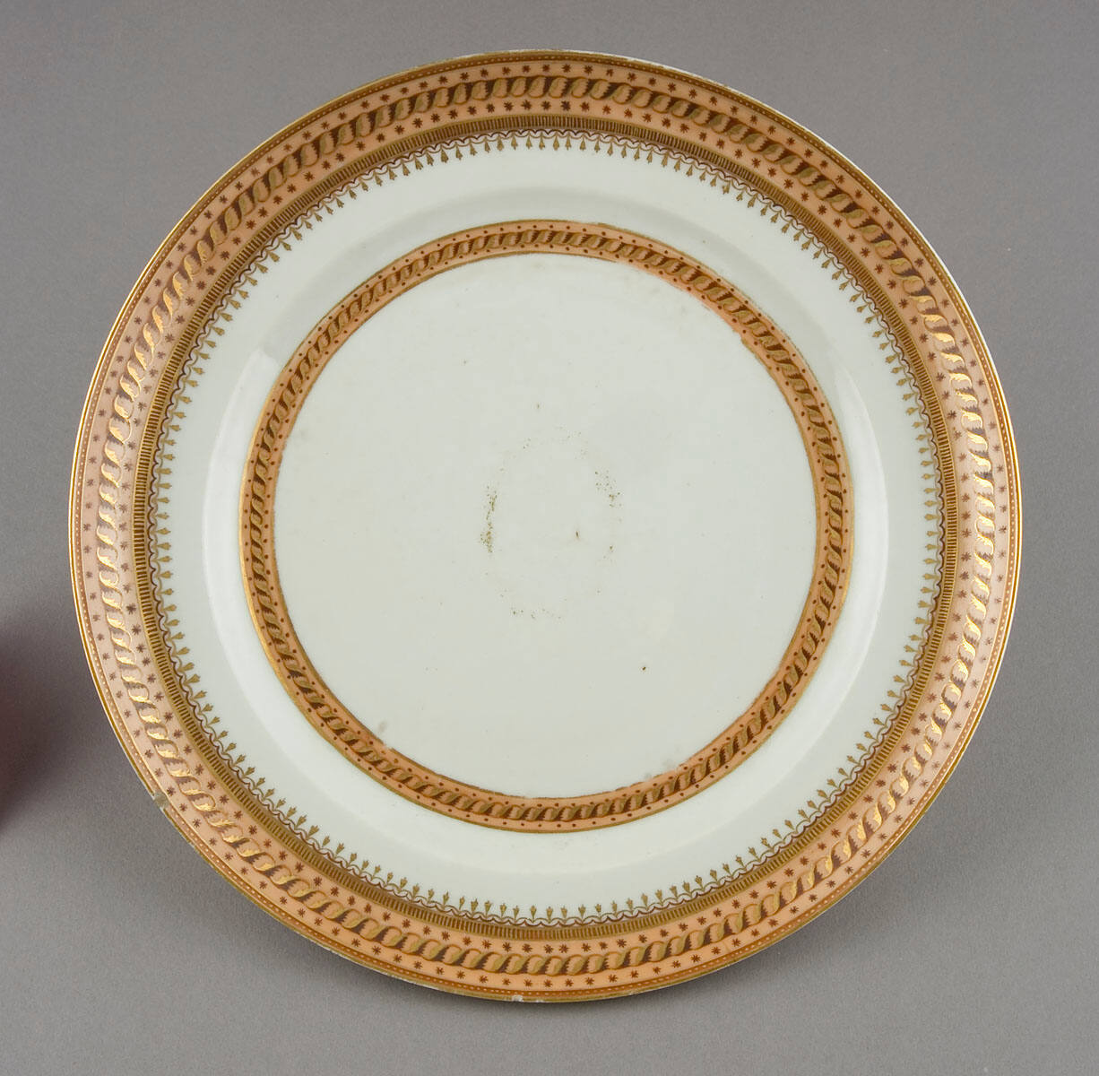 DescriptionOrange and sepia borders. Oval medallion with initials erased.