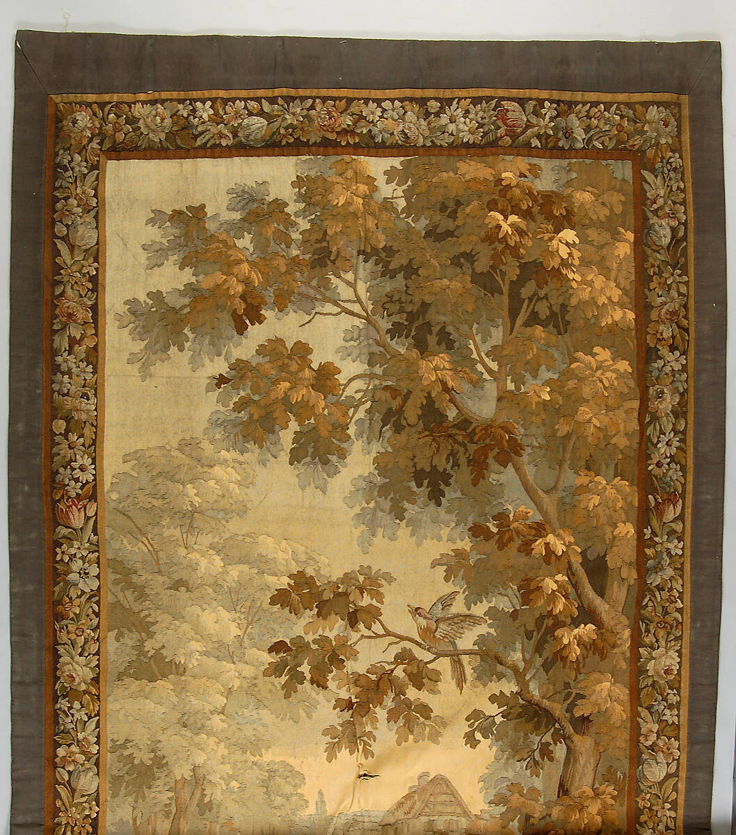 DescriptionPair of Portieres. Foilage design with swan and houses and windmill in background. Flowered border with plain green border applied. Hand woven. Lined with tan colored flowered brocade. Lining is a tan brocaded twill textile. Outstanding colors are brown, beige, grey, and reds.Provenance