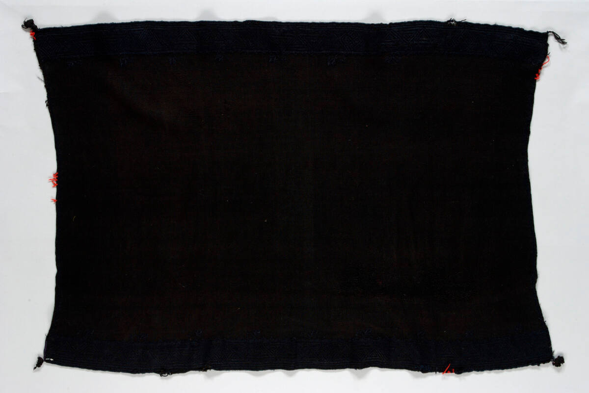 MediumBlack handspun churro wool with black overdye, indigo blue, and red embroidery (later addition)