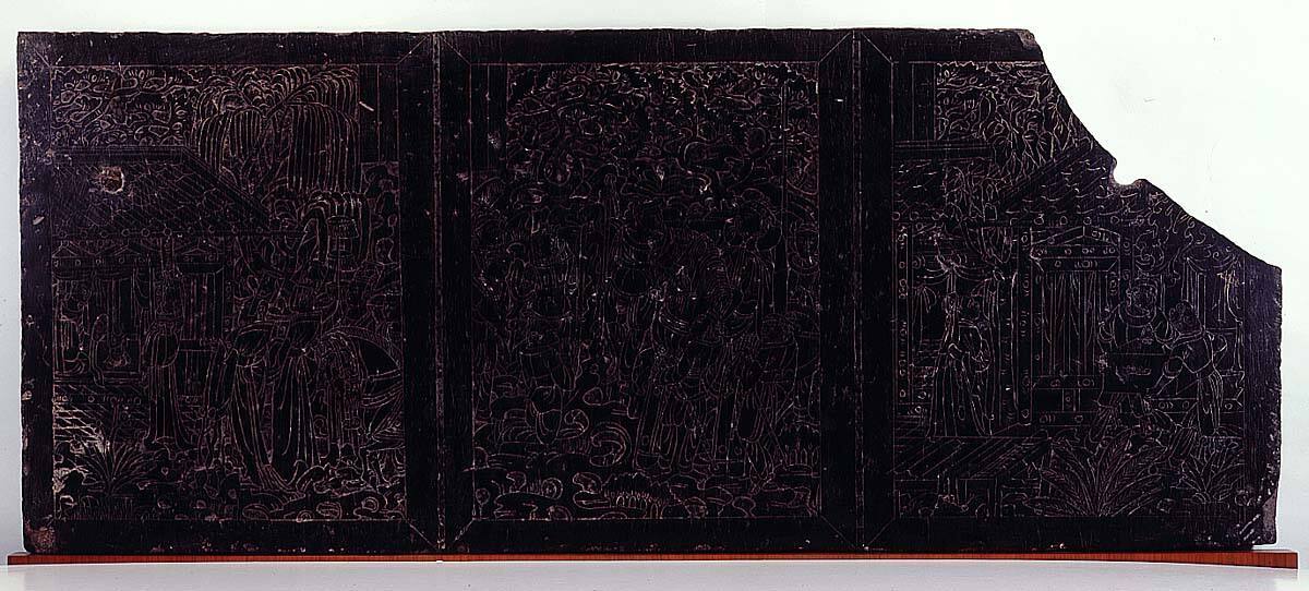 These stone slabs once formed the three sides of a funerary couch. A stone couch, known as spirit couch, served for the owner’s afterlife in the tomb. It recalls domestic furniture used by the living for sitting or reclining. Three of the four displaced slabs are engraved with scenes from the stories of filial piety and of virtuous women. This set was made several decades later than the sarcophagus on the opposite wall. Similar to the sarcophagus, the message of the stories is fundamentally didactic, demonstrating the moral values of the owner. The narratives show similar episodes in landscape settings, but the vertical compositions are more condensed than the earlier engravings.