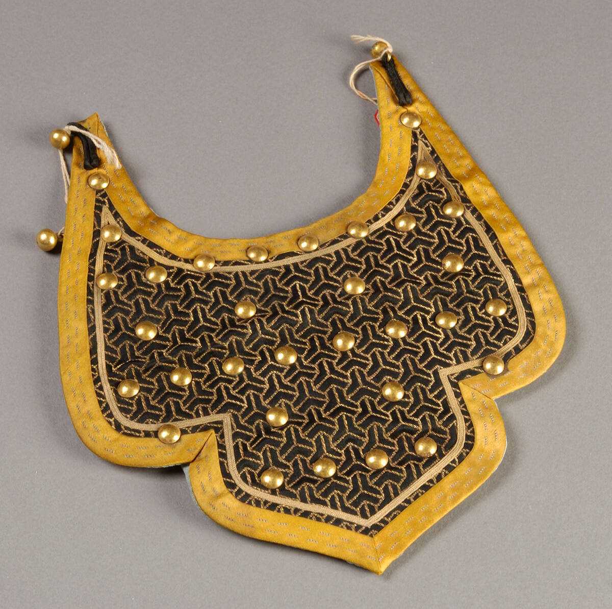 DescriptionPiece from suit. Gold and black brocade in scale armor pattern, lined with steel plates and studded with gilt bronze nails.