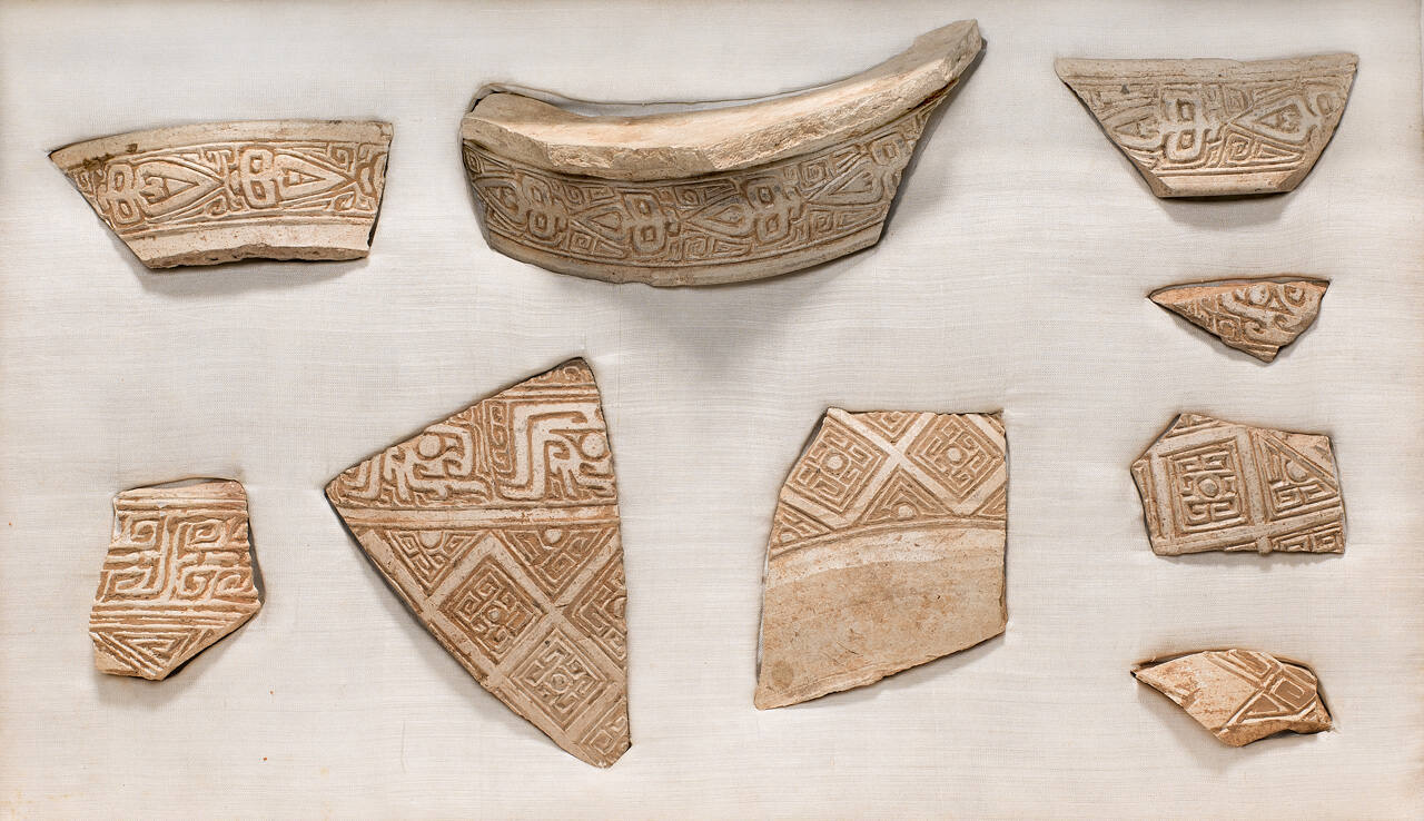 DescriptionOne of nine fragments of one or more pottery vases, with incised geometric designs, cicadas and Kuei.