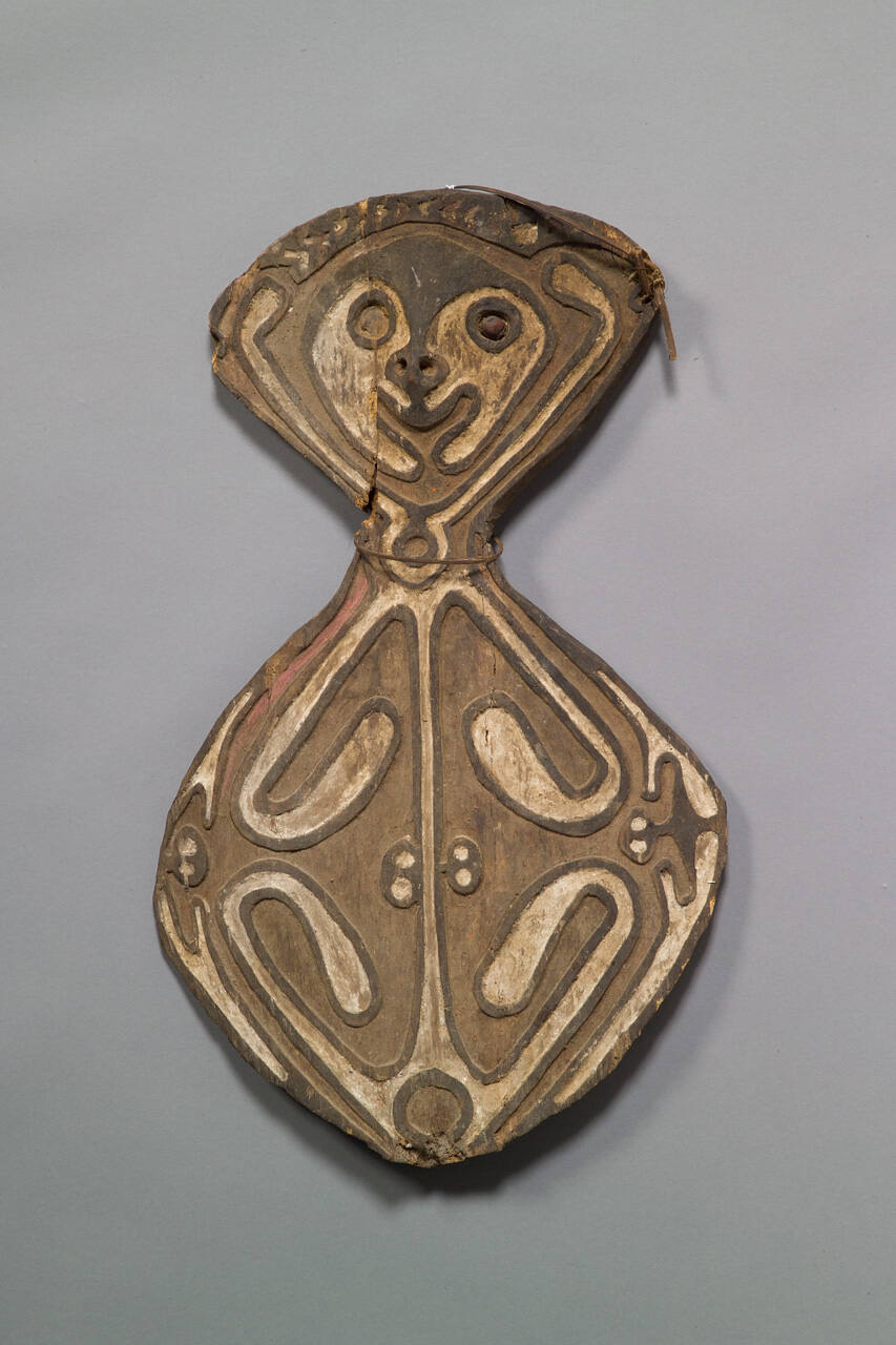 DescriptionShieldlike form with head and neck articulated at th eupper third of the board. Crack on left side of head; runs from top of board through eye to left side of neck. Low relief surface decoration. Raised border lines surround the shield and delineate the curvilinear two-dimensional recessed design areas, which are bilaterally symmetrical. Sculptural emphasis given to the nose. Black on raised areas with white pigment in recessed areas. Traces of red pigment in recessed area on left area of board.