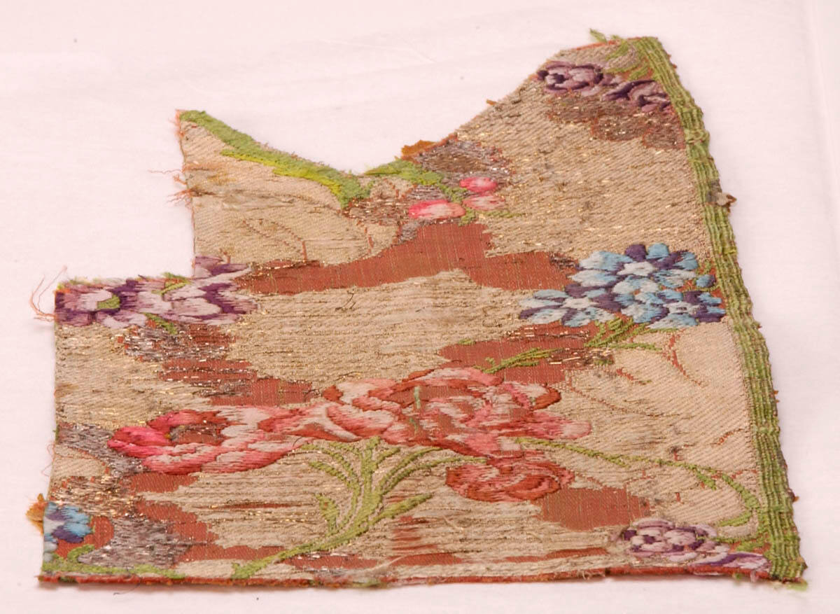DescriptionNaturalistic design of roses and stems in red and white on a background of gold and brown.