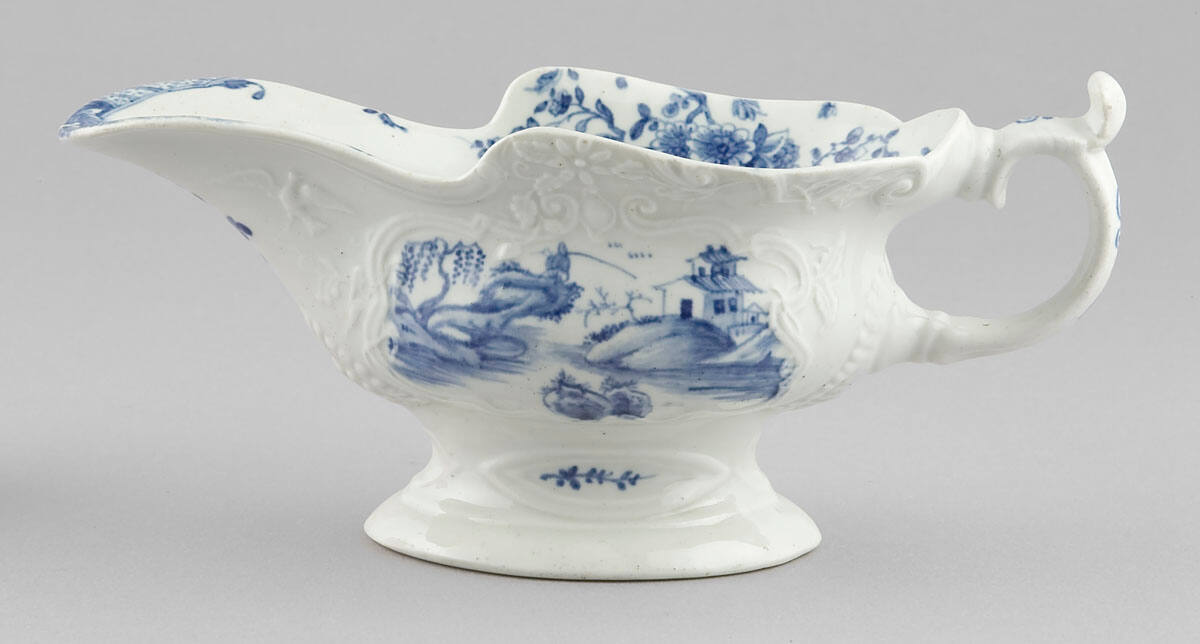DescriptionEmbossed shell and flowers with panels of pagoda and lake.
