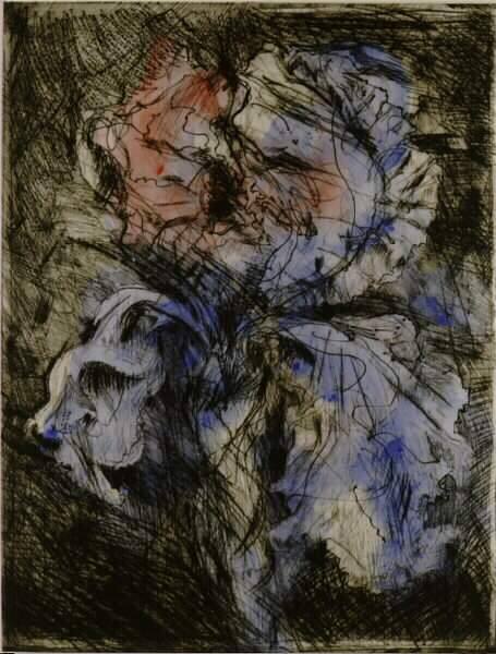 DescriptionOn pale gray ground overlaid by swirling black strokes and dotted lines, large blossom with nearly closed petals above, trio of opened petals below, tinted with blue wash overall, except for pink areas top left and center. Blue coloring beyond right margin, 1/3 up, and lower margin, center.