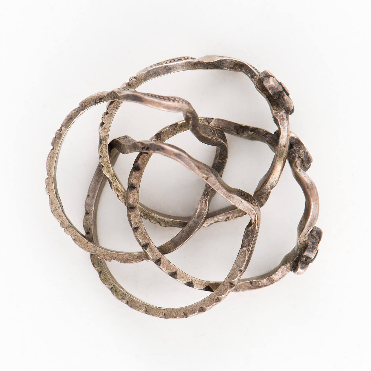 DescriptionPuzzle consisting of four interlocking silver rings with three small flowers.