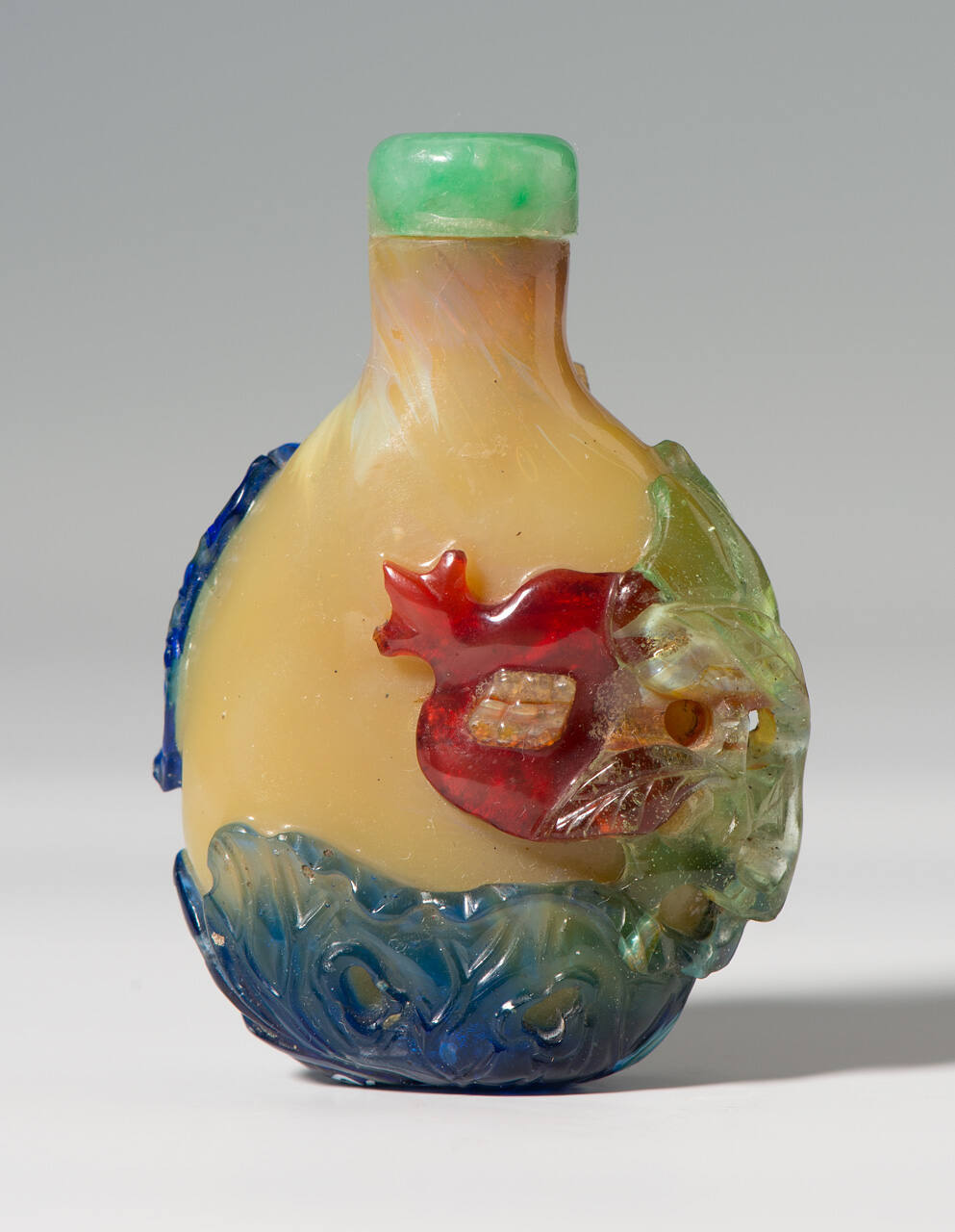 DescriptionOf flattened pear shape, the honey-toned metal with white swirls overlaid with two blue lotus pads, one covering and forming the base, the other reaching up one side, a light translucent green peach, a finger citron, and a ruby-red pomegranate.