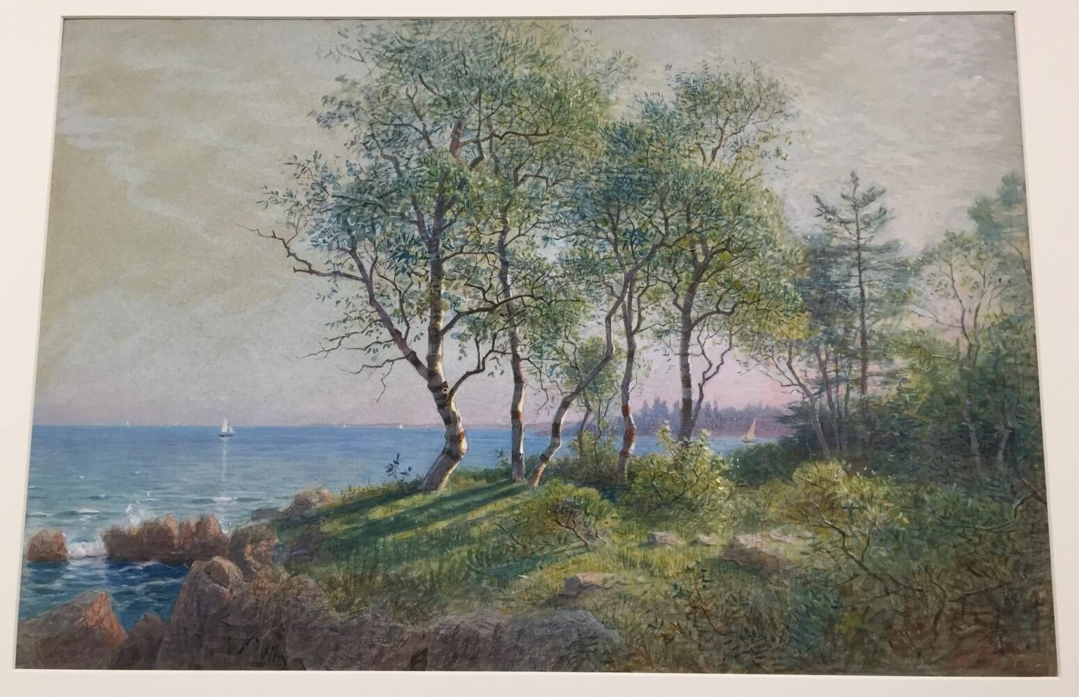 Gallery LabelWatercolor was a medium for personal fulfillment for William Stanley Haseltine. He never attempted to promote his watercolors during his career. Although known for his oil on canvas paintings, Haseltine frequently used watercolor to document landscapes while traveling that he later used for inspiration. During these trips, he sketched outdoor scenes in watercolor. He then returned to his studio to create compositions in oil. Northeast Harbor, Maine is one such watercolor landscape made using shortened brushwork and a limited palette of greens, blues, browns, and yellows. These works are often on the blue textured paper seen here.