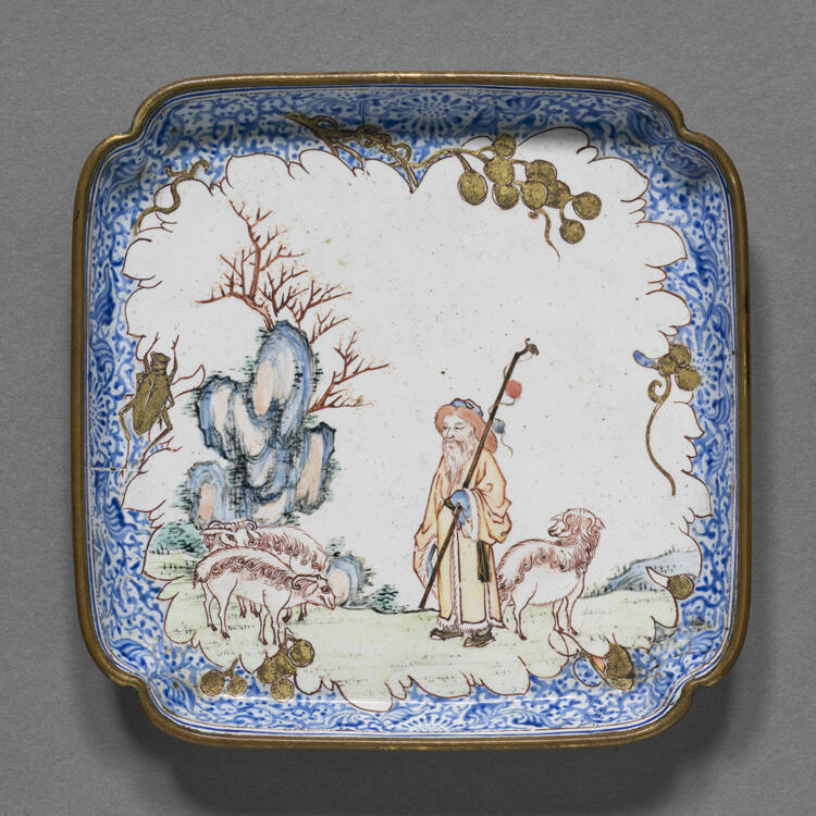 DescriptionChien Lung Canton square saucer with quatrefoil corners. One of a set of six wine cups and saucers decorated with scenes depicting old stories of the twenty-four paragons on filial piety. This saucer depicts a bearded shepherd wearing a fur-lined robe, holding a staff and standing amid three white goats.